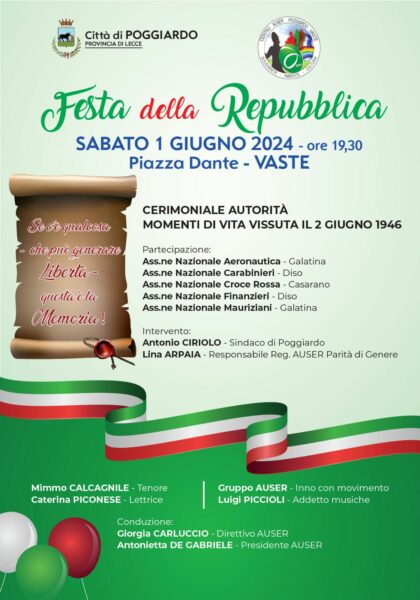 “Se c’è qualcosa che può generare libertà, questa è la Memoria”. Il Circolo Auser di Poggiardo-Vaste ha celebrato così, da par suo, con l’attenta e come sempre efficiente regia di Antonietta De Gabriele, la Festa della Repubblica, dando spazio, in piazza Dante, a ricordi, riflessioni, emozioni.